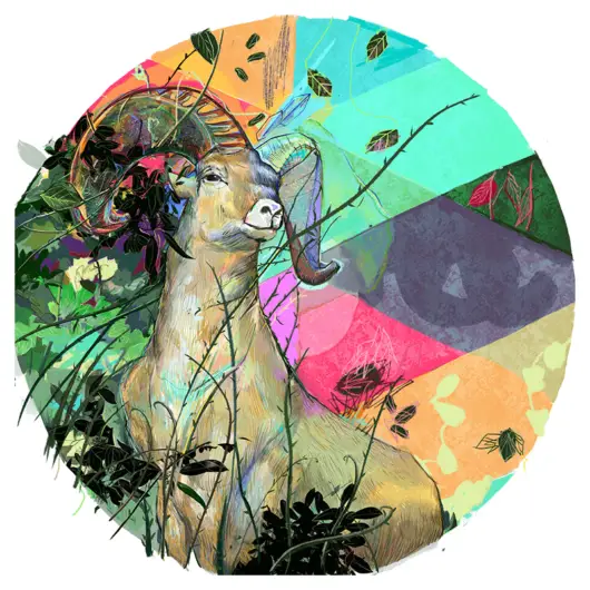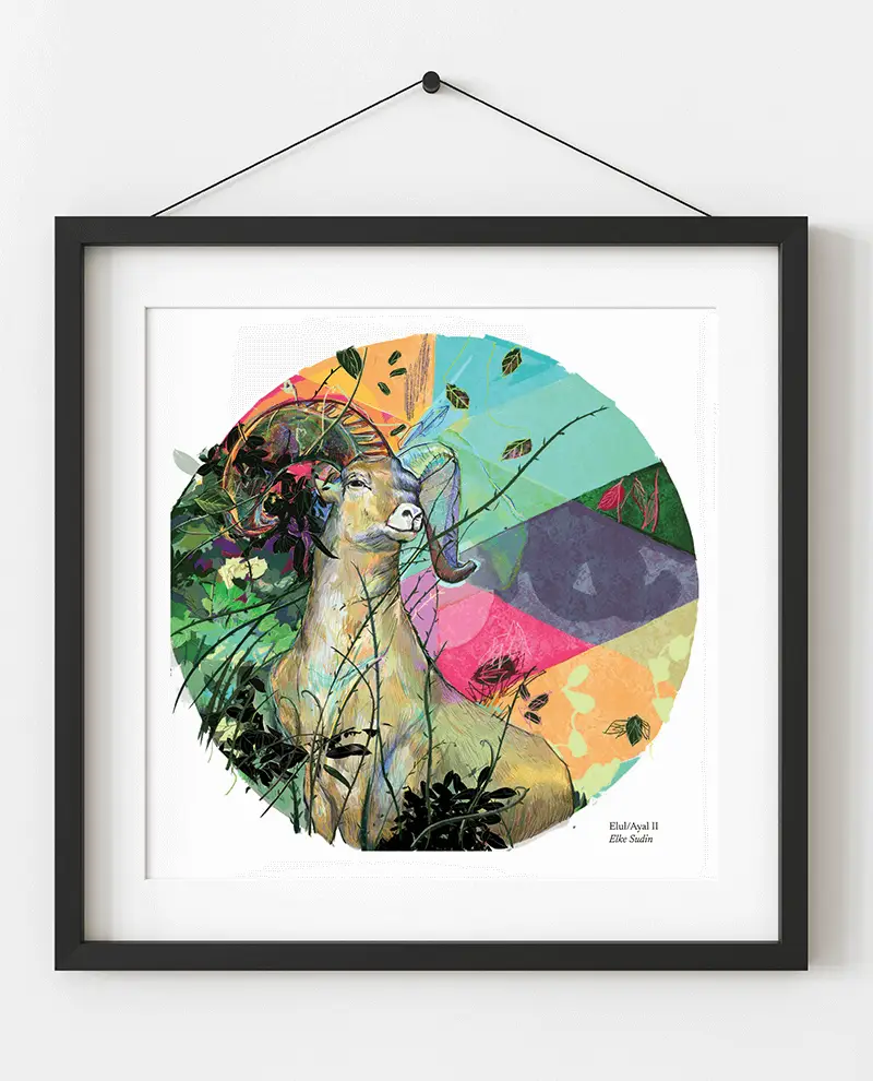 Limited edition giclée print (12 in. x 12 in. square) of “Elul 5782” by Elke Reva Sudin, on high quality paper in bright colors, capturing the Ram of Isaac’s dramatic moment of entaglement in colorfully compelling artistic style.