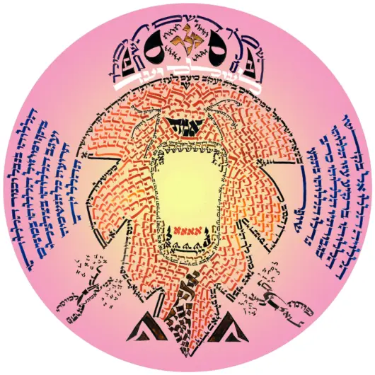 Limited edition giclée print (12 in. x 12 in. square) of “Nissan 5779” by Kalman Delmoor, on high quality paper in bright colors, featuring a masterfully composed rendition of a classic Shiviti, or visual aid to profound Kabbalistic meditation.